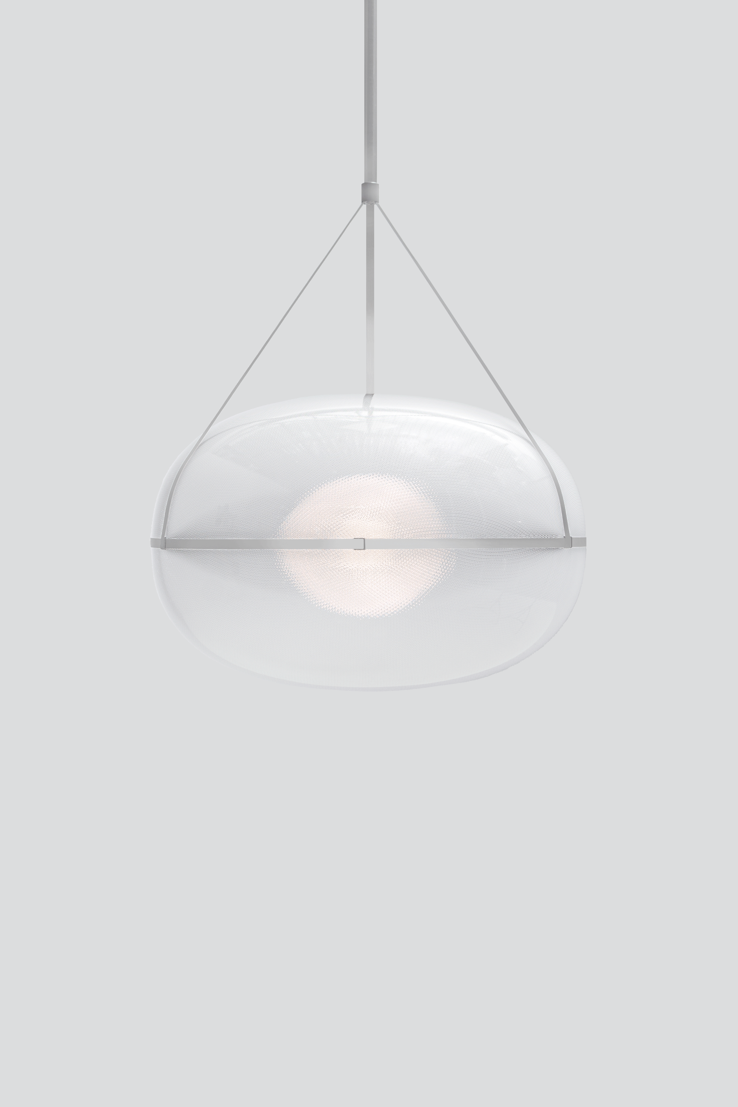A kaleidoscopic light extends from the orb-like source of the Iris, traveling beyond its crystalline surface. Encased in an elliptical shell, the Iris performs with a weightlessness that lends it an aerial quality. Voluminous and vast, it enters a room with salient scale.